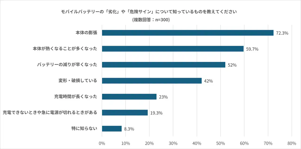 バッテリーの安全判断方法を見ると、「見た目(膨張など)で判断」58.7%、「使用時の発熱で判断」44.3%が多い一方、「特に確認していない」13.3%と「判断方法がわからない」8.0%を合計すると約21%が安全確認ゼロ。劣化・危険サインを「特に知らない」も8.3%おり、引っ越しで出てきた古いバッテリーをそのまま自宅で保管し続ける可能性があります。 |