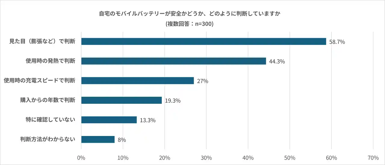 「特に確認していない」13.3%+「判断方法がわからない」8%=21.3%が、 バッテリーの安全性をまったく確認せずに保管・使用している。 |