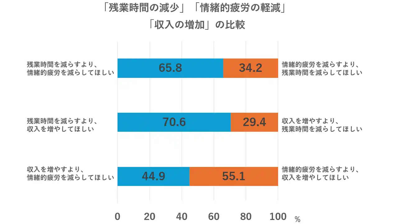 | 最後に、「収入を増やすより、情緒的疲労を減らしてほしい」と回答した人が44.9%、「情緒的疲労を減らすより、収入を増やしてほしい」と回答した人が55.1%と、情緒的疲労の減少より収入を増やすことへの期待が10.2ポイント高かった。 | ||||||||||||||||
