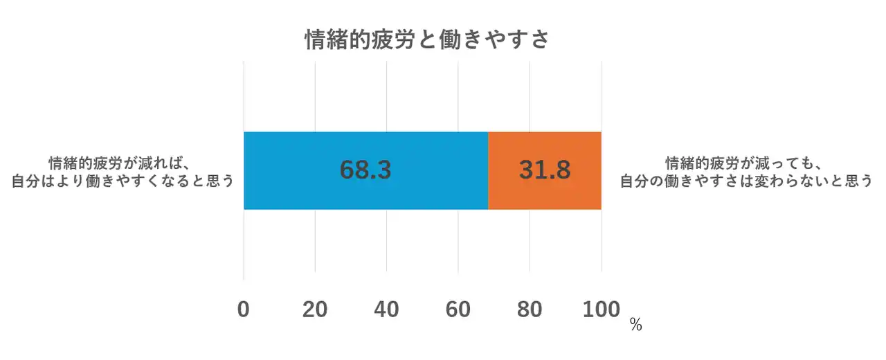 | 仕事・職場環境においてどのような思いを抱いているのかを尋ねた質問のうち、「情緒的疲労が減れば、自分はより働きやすくなると思う」と回答した人は68.3%、「情緒的疲労が減っても、自分の働きやすさは変わらないと思う」と回答した人は31.8%となり、両者には36.5ポイントの差がある。こうした結果から、情緒的疲労が働きやすさに影響を与えていることがうかがわれる。 | ||||||||||||||||