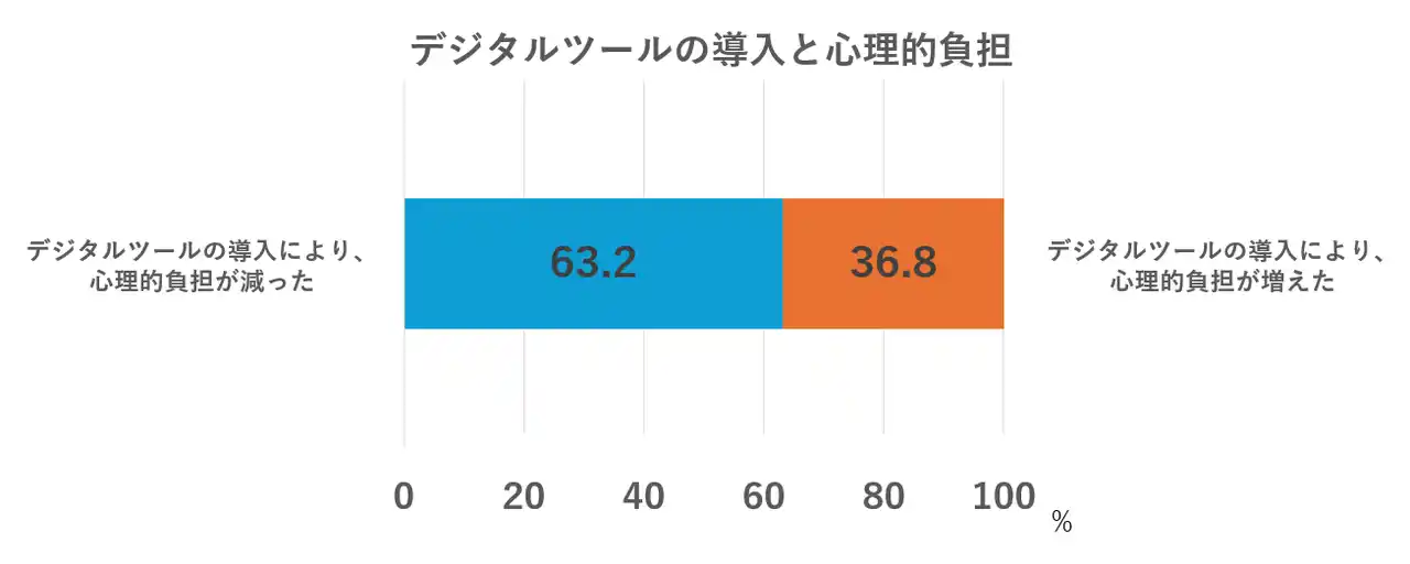 | 多くのデジタルツールが仕事・職場環境に導入されており、それらに対して労働者はどのような感情を抱いているのか、特に心理的負担に焦点を当てて尋ねたところ、デジタルツールの導入により「心理的負担が減った」と回答した人は63.2%、「心理的負担が増えた」と回答した人は36.8%であった。デジタルツールはどちらかというと、心理的負担の軽減に貢献していることを示唆する結果となった。 | ||||||||||||||||