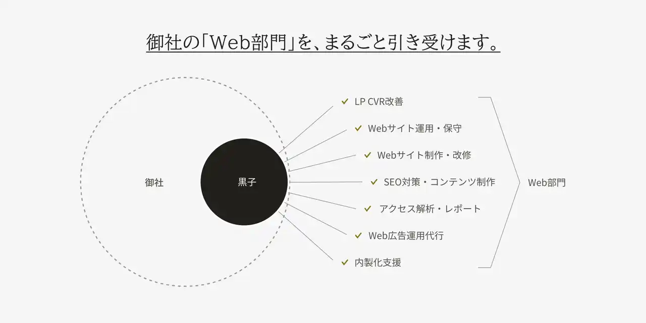 こうした状況を背景に、企業のWeb運用を実務レベルで支援する外部Web担当者サービスとして「黒子(くろご)」を立ち上げました。 |