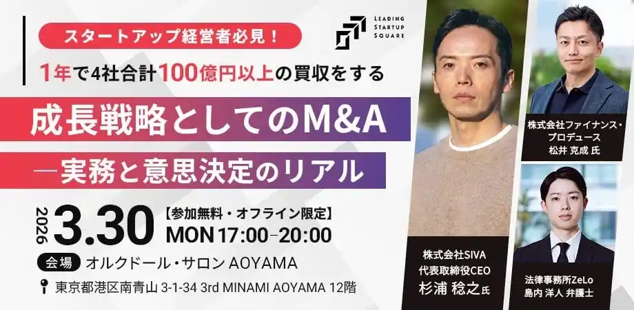 業界特化型ソフトウェアグループの株式会社SIVA(本社:東京都港区、代表取締役CEO:杉浦稔之、以下「SIVAグループ」)の杉浦稔之は、3月30日(月)に開催されるLeading Startup Square(LSS)主催のイベント「スタートアップ経営者必見!1年で4社合計100億円以上の買収をする成長戦略としてのM&A ―実務と意思決定のリアル」に登壇することをお知らせします。 |