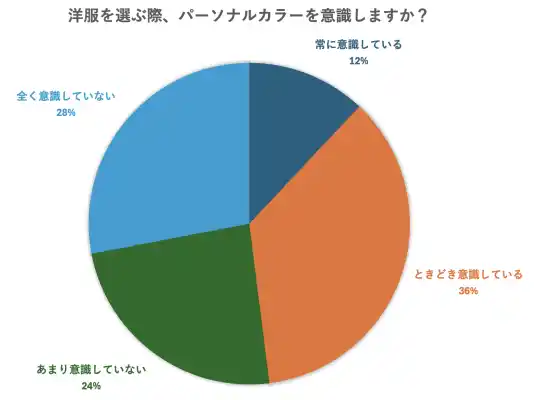 一方で、「常に意識している」「ときどき意識している」と回答した人も一定数おり、パーソナルカラーを参考にして服を選んでいる人も見られます。