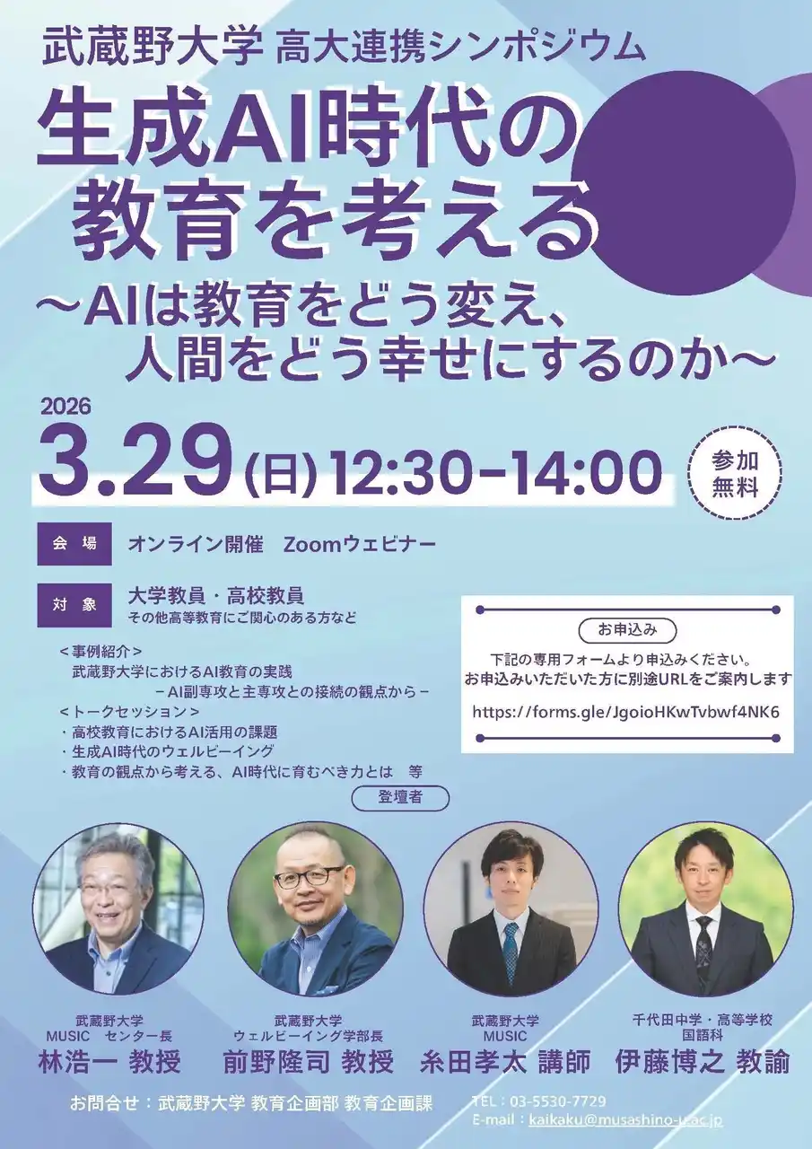 武蔵野大学(東京都江東区、学長:小西 聖子)は3月29日(日)に高大連携シンポジウム『生成AI時代の教育を考える~AIは教育をどう変え、人間をどう幸せにするのか~』を開催します。 |