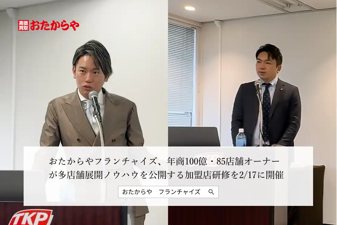 高価買取 おたからやのフランチャイズ事業を展開する株式会社いーふらん(本社:神奈川県横浜市、代表取締役社長:鹿村大志。以下、「当社」という)は、2026年2月17日(火)に既存加盟店オーナー向けの研修会を開催しました。新規事業として加盟してから6年で年商100億円を達成し、昨年1年間で44店舗出店した株式会社アンビションの塚本拓夢代表取締役を講師に迎え、多店舗展開のノウハウを公開しました。 |