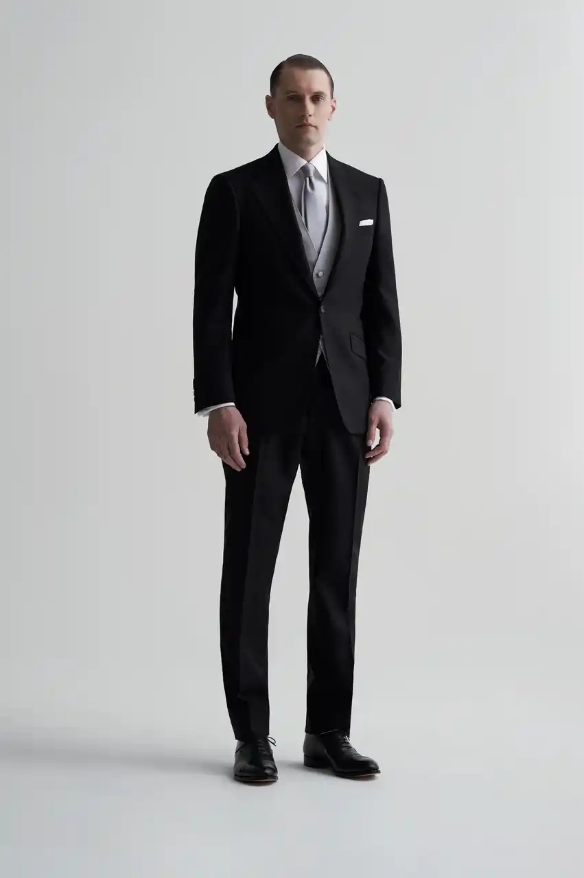 織りと仕上げ加工により、非常にしっとりとした柔らかな風合いを持つウール素材により、長時間の着用でも心地よさが持続。さらに、ピーク襟が、英国仕立ての品格を漂わせ、洗練された着こなしを完成させます。格式と実用性を兼ね備えた、まさに現代の英国紳士像を体現する逸着です。 |