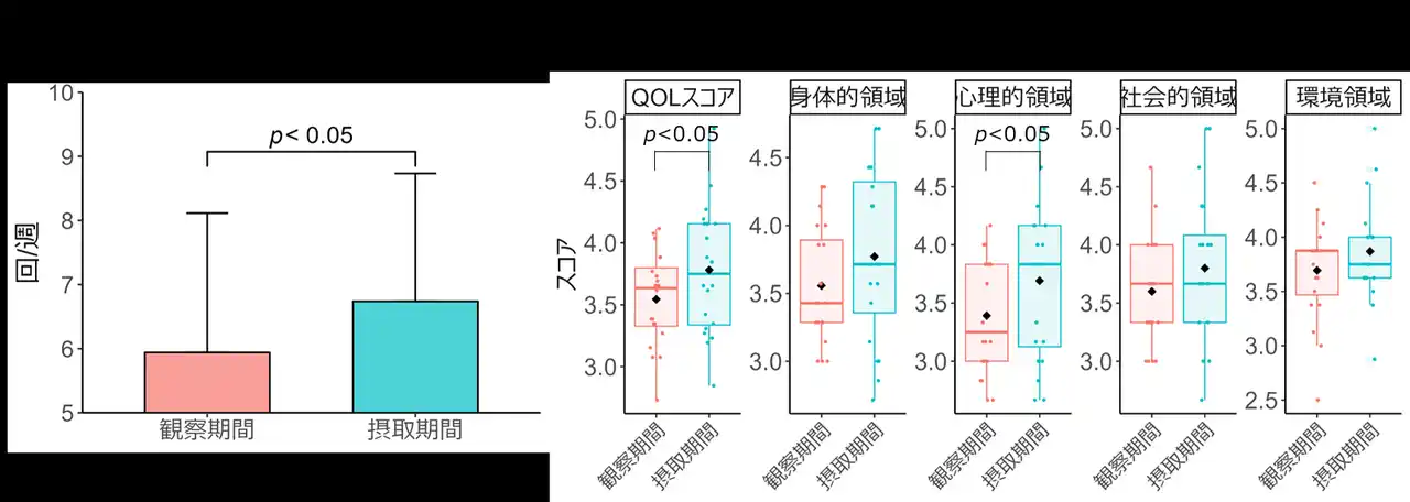 図 1. 大豆ヨーグルト摂取による排便回数及びQOLの変化 4週間の大豆ヨーグルト摂取前後での排便回数の変化(A)及びQOLスコアの変化(B)を調べました。QOLは質問紙WHO-QOL26を用いて評価しました。結果、摂取前と比較して、排便回数の有意な向上、QOL全体スコア及び心理的領域のスコアの有意な向上が見られました(Wilcoxonの符号付順位検定による観察期間との比較)。 |