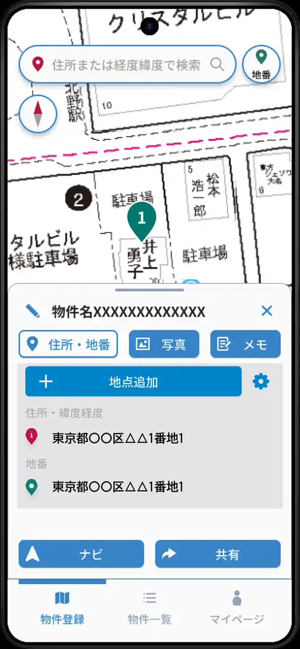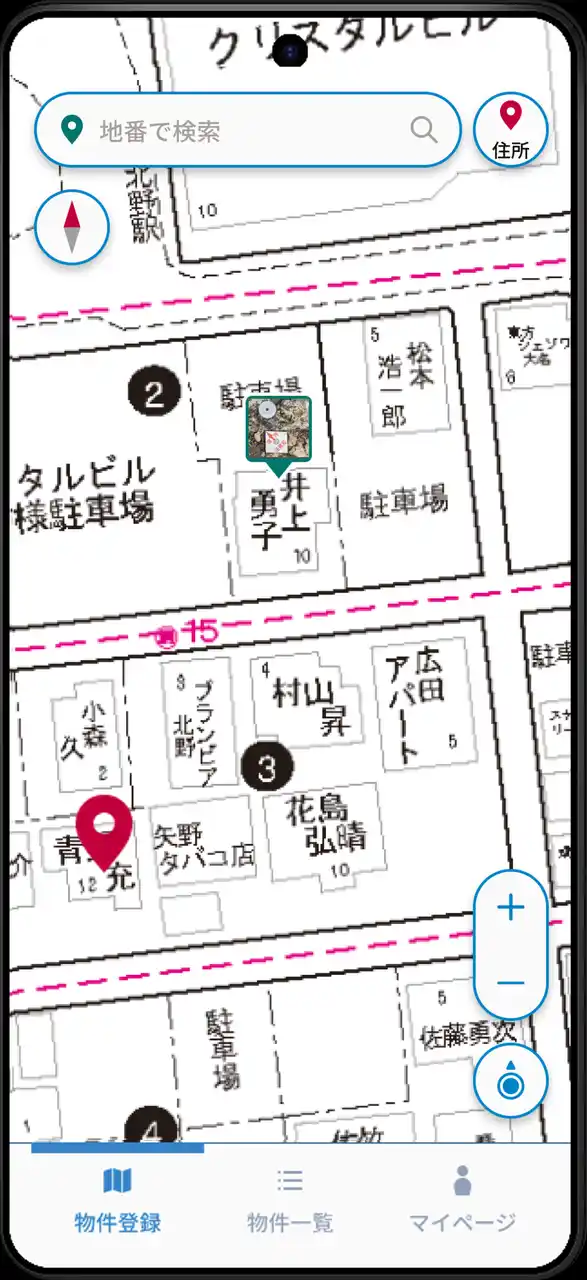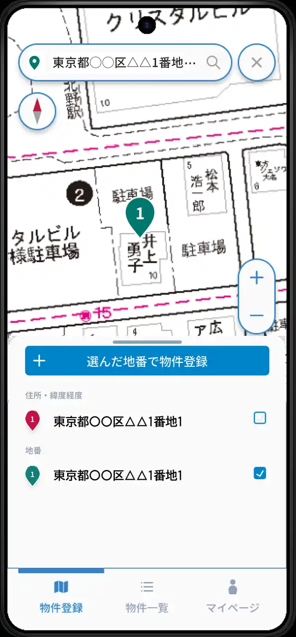 表示された地点から住所や地番を選択して物件登録 |