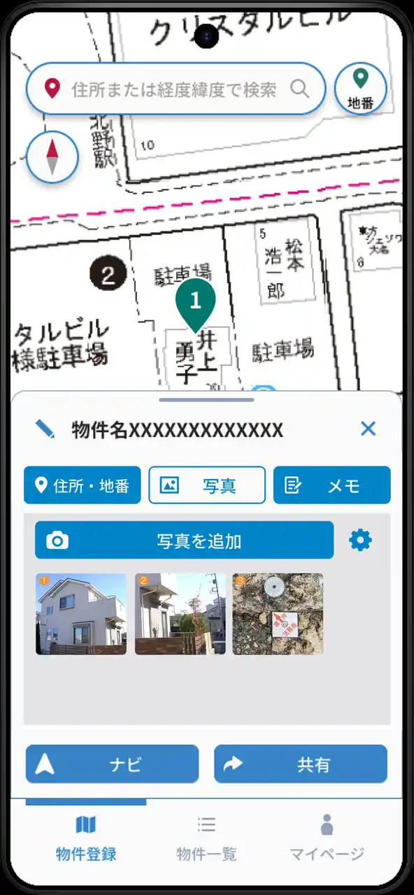 どの場所で撮影した写真かを確認できるほか、物件ごとに写真とメモをまとめて管理すること |