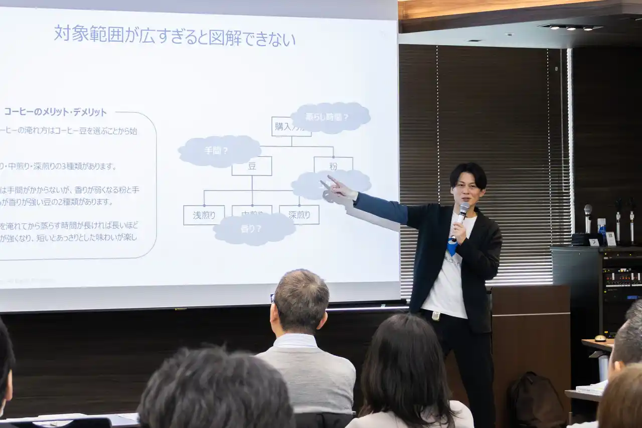 | 情報を「わかりやすく」「シンプルに」「伝えやすく」することを目的に、あらゆるモノゴトを図解して整理する思考法『ダイアグラムシンキング』のスキルを、ワークを通して習得しました。 | |||||||||||||||||||