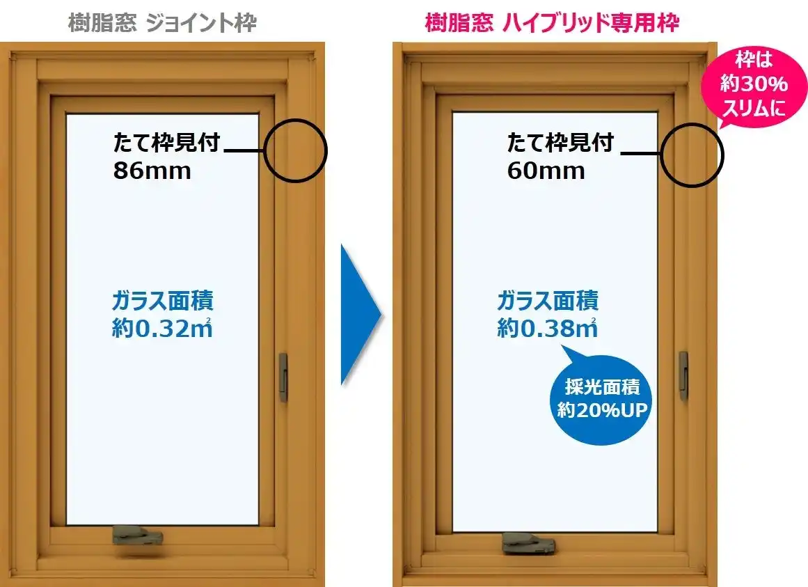 ■ハイブリッド専用枠で見付をスリム化し、採光面積が約20%アップすることで、すっきりとした意匠性を実現 |