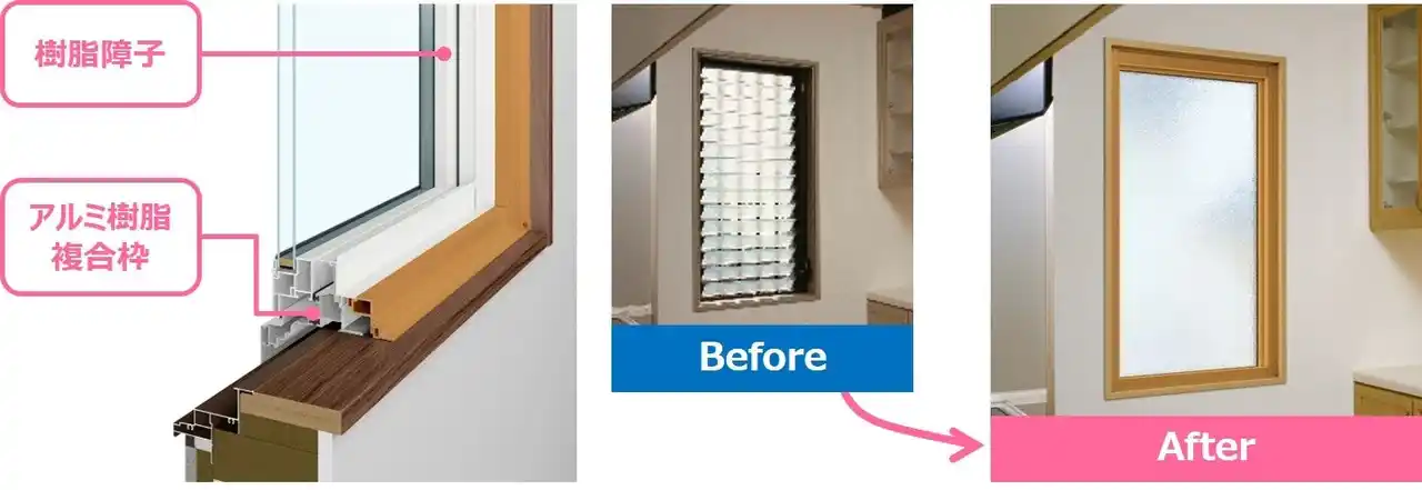 従来の「マドリモ 戸建用」樹脂窓 ジョイント枠では、ストック住宅のプロジェクト窓に多い幅や高さのサイズが小さい窓に対応ができませんでしたが、ハイブリッド専用枠になることで幅が40センチ程度の小さいサイズにも対応できるようになります。ストック住宅の洗面所やキッチンなどの水回り空間に多用されたガラスルーバー窓(※3)は、換気能力に優れている反面、断熱性能が悪く、すき間風や砂ぼこりが入るといった困りごとを抱えている窓種です。今回の新商品では既設の窓がガラスルーバー窓などで多い幅が小さい窓にも対応ができるため、断熱性や気密性の高い樹脂窓に交換することで快適性をより感じていただけるアイテムです。 |