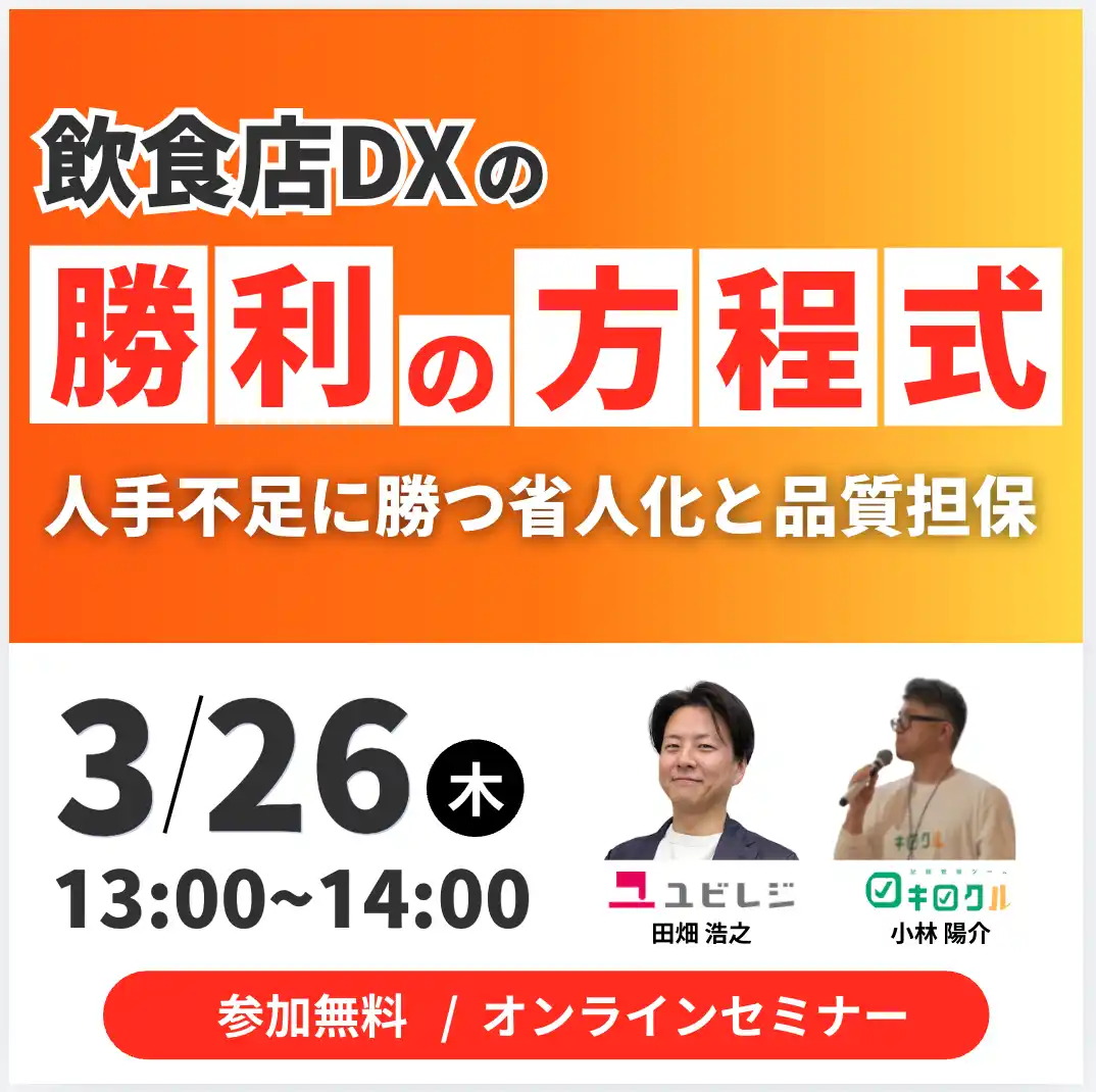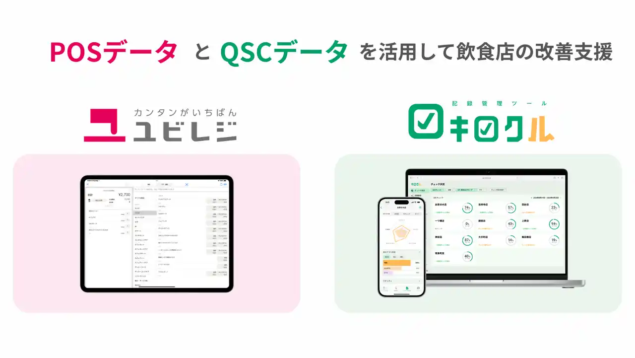 “カンタンがいちばん”がコンセプトのクラウドPOSレジ「ユビレジ」を提供している株式会社ユビレジ(本社:東京都渋谷区、代表取締役:木戸 啓太)は、QSCチェックツール「キロクル」を提供する株式会社スマート・ソリューション・テクノロジー(本社:東京都新宿区、代表取締役:出野 勝也、以下「SST」)と、飲食店の店舗運営改善を目的とした連携を開始いたしました。また、2026年3月26日(木)には、DXによる省人化と品質担保をテーマとしたオンラインセミナーを開催します。 |