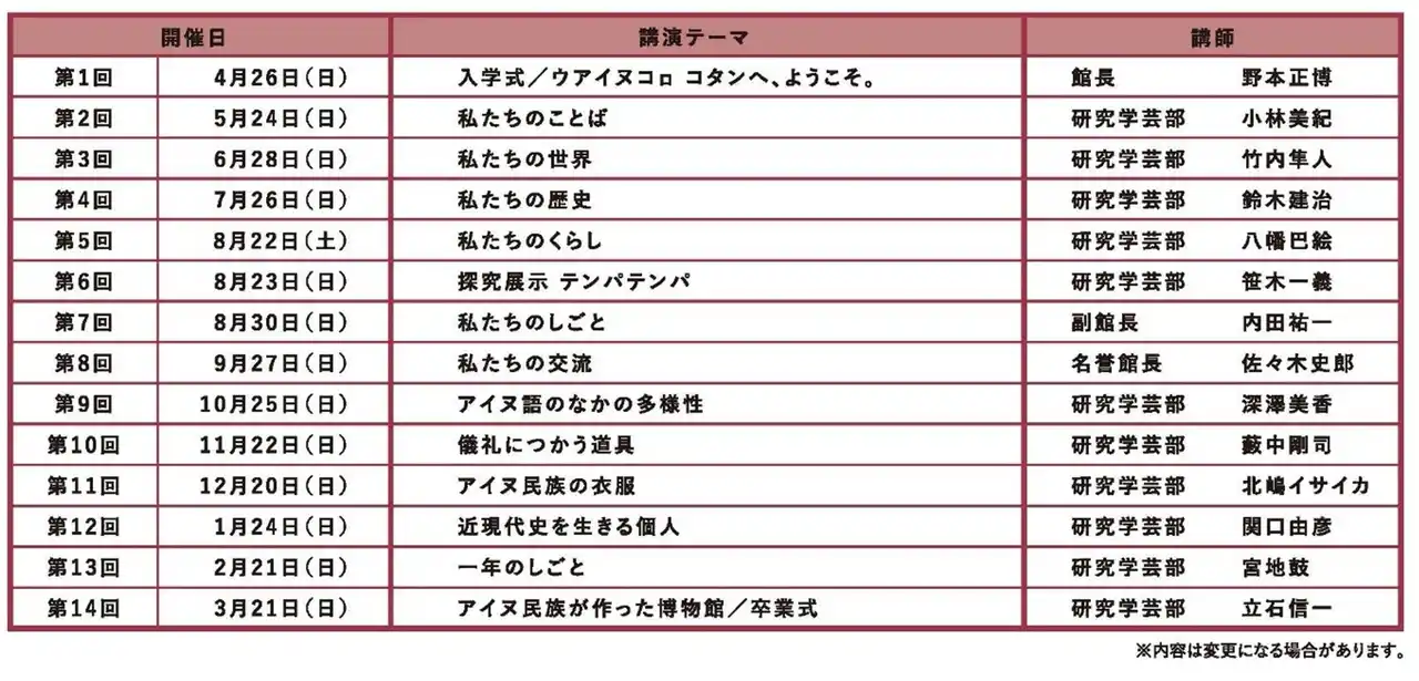 開講初年度のテーマは「基本展示をよりよく知る、学ぶ」として、アイヌ民族の歴史・文化・言語などの基本展示の6つのテーマに沿って、基本展示を体系的に学ぶことができる座学形式のプログラムを予定しています。