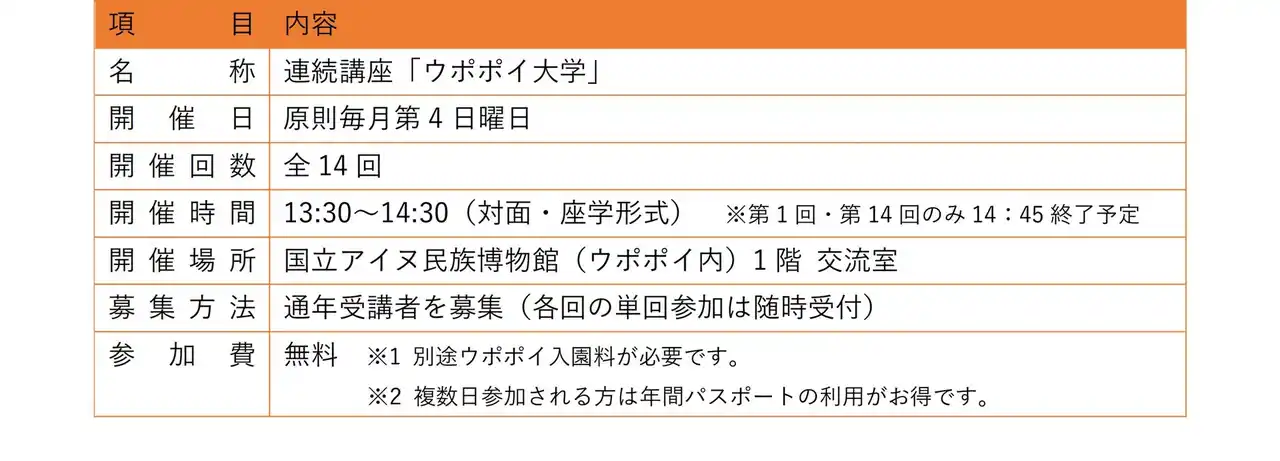 ウポポイ大学では、当館を訪れた方々からの、「もっと深く知りたい」「展示資料の説明だけでなく、その文化的背景まで理解したい」などの要望に応えるため、さらに一歩踏み込んで学べる場を提供します。 |