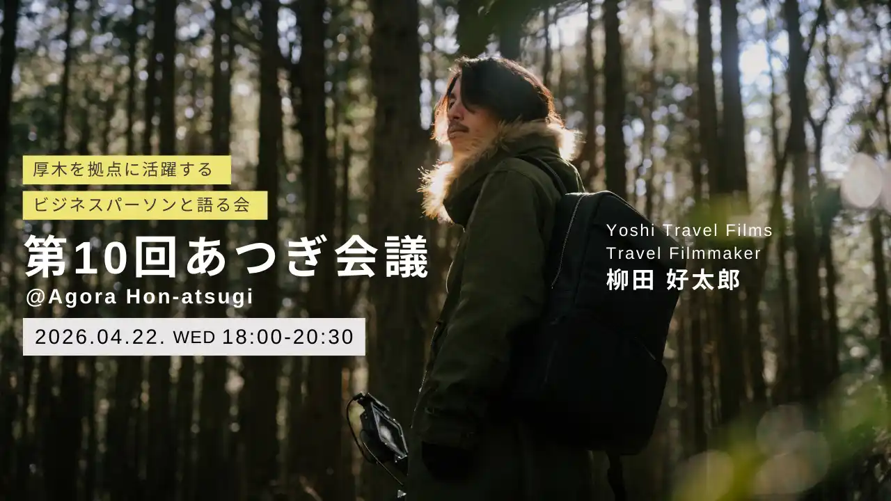 インキュベーションオフィス AGORA Hon-atsugi(以下、AGORA Hon-atsugi)にて、2022年10月より始まった、座談会形式のビジネスイベント「あつぎ会議」。このイベントは厚木を拠点に活躍するビジネスパーソンと語り合い、地域との交流機会を創出するという趣旨のイベントです。第10回は2026年4月22日(水)、「Yoshi Travel Films(ヨシトラベルフィルムズ)」Travel Filmmaker、柳田 好太郎(ヤナギタ ヨシタロウ)氏をお呼びして、作品を通してこれまでの軌跡を伺います。 |