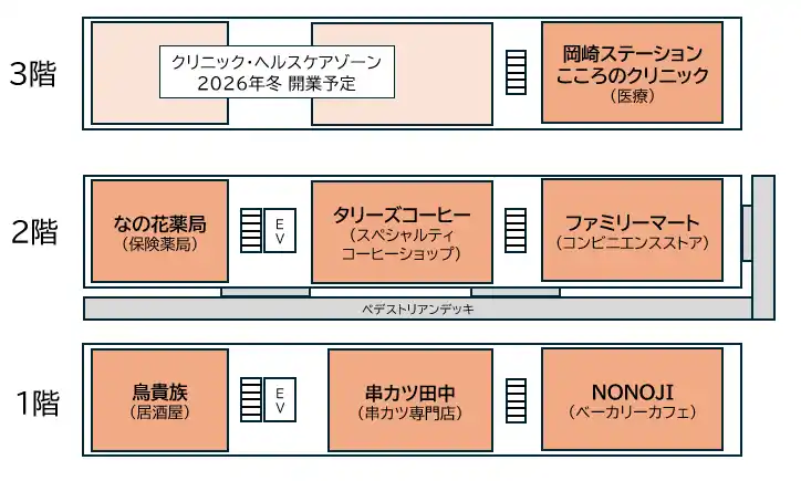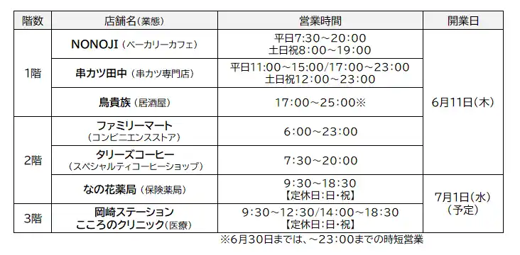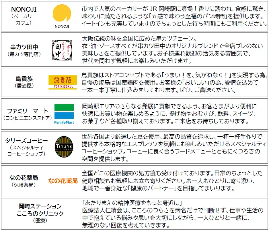 | 名古屋ステーション開発株式会社は、JR岡崎駅東口において複合施設の開発を計画し、2025年4月より工事を開始しておりましたが、この度、開業日、出店店舗が決まりましたのでお知らせします。 | |||||||||