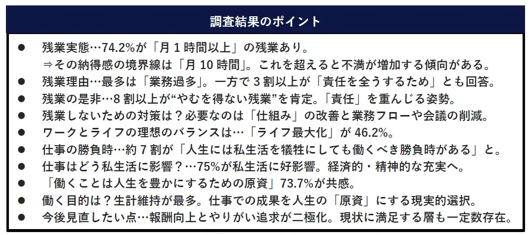 そこで今回、ビジネスパーソンの残業に対する意識にフォーカスして仕事が私生活に与える影響などについて調査しました。本調査を通じ、現代における「働くことの真の意味」を浮き彫りにします。 |