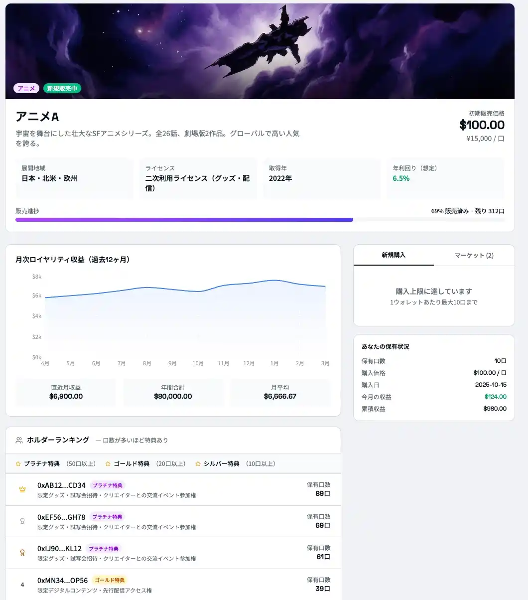 新たにトークン化されたIPのライセンスを「1口」単位で購入できます。 |