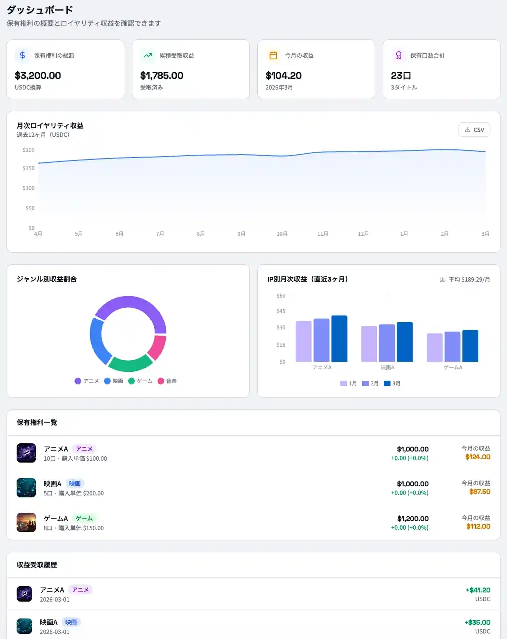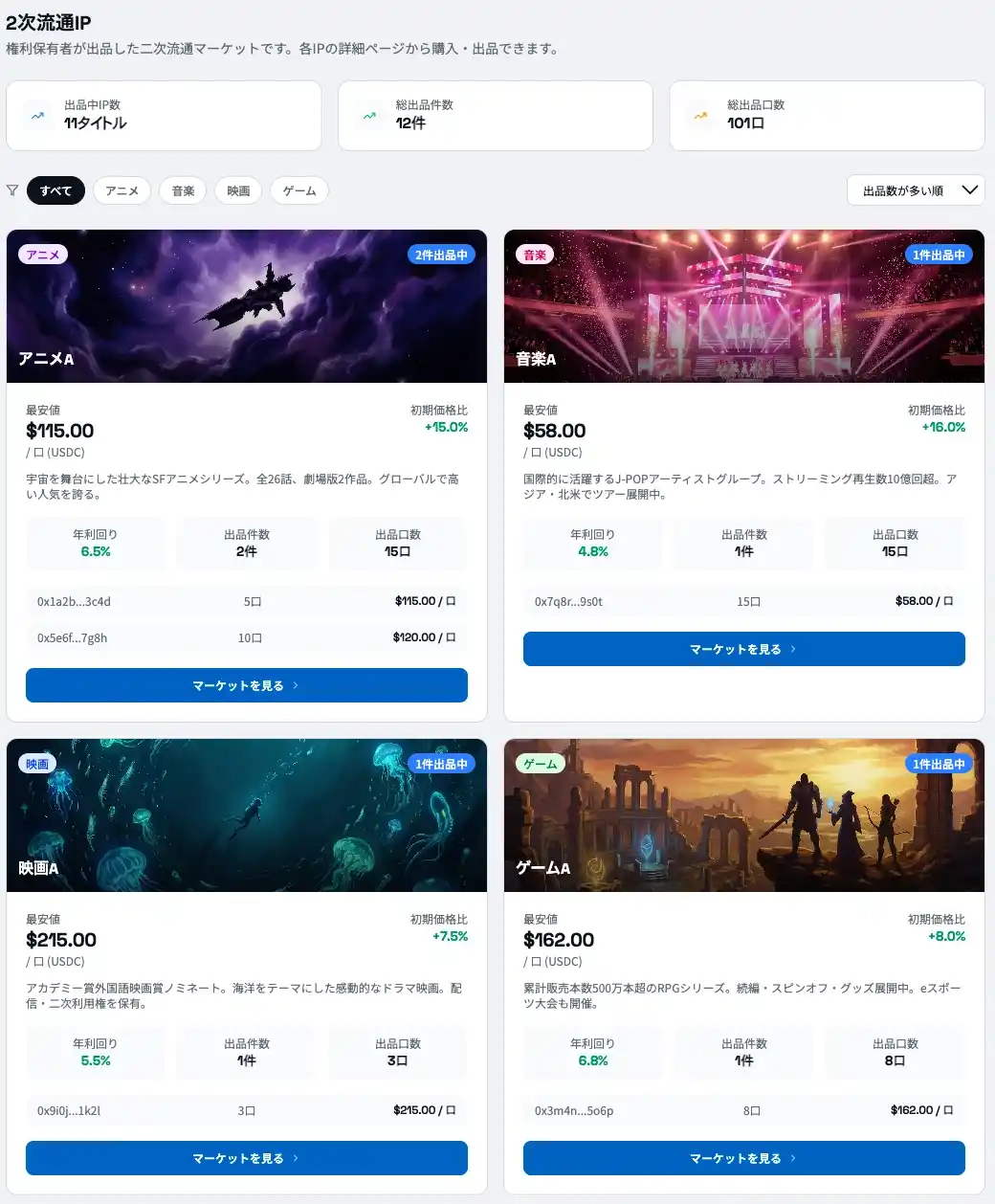 アニメの配信権、楽曲のストリーミングロイヤリティ、映画の二次利用権、ゲームのライセンス収益など、従来は一部の事業者しかアクセスできなかったIPの権利を、ブロックチェーン上のトークンとして小口化。保有者はIPが生み出すロイヤリティ収益を受け取ることができます。 |