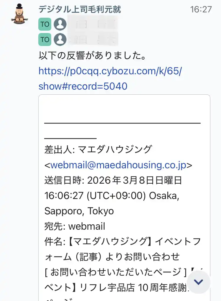| デジタル上司による反響割り振りは、現在は反響内容を見てスタッフが割り振る部門を決めておりますが、将来的にはお客様のご連絡内容をAIが判断して担当店舗(部門)へ割り振ることでお客様のお困りごとをより早く解決ができるように取り組んでまいります。 | |||||||||