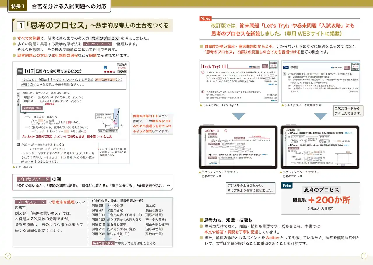 ★節末、巻末の難問題にも「思考のプロセス」★ 「思考のプロセス」は、入試問題のような難度が高い問題においてより効果を発揮します。 そこで、改訂版では節末問題「Let’s Try!」や巻末問題「入試攻略」にも「思考のプロセス」を新設しました(WEBサイトに掲載)。 |