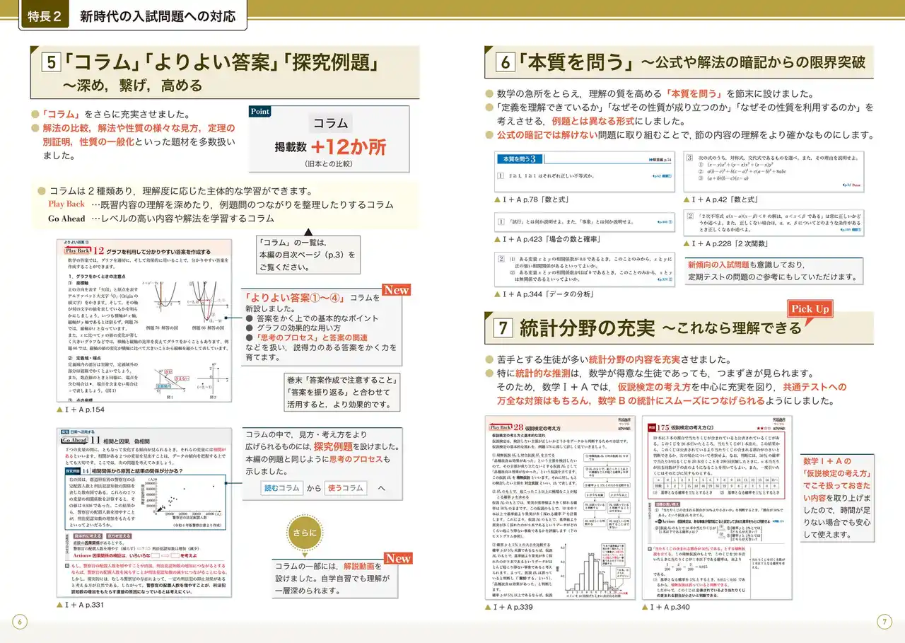 コラムも充実しています。新傾向の問題をまとめた【探究例題】では,様々な事象に対して考察を深める力を養えます。また,「よりよい答案」のかき方を新設しました。 |