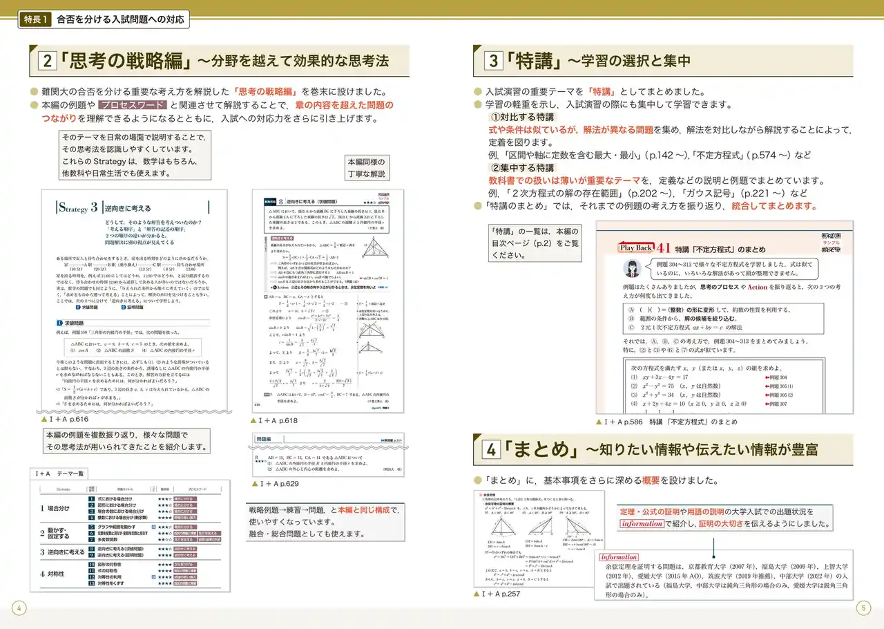 すべての例題に,解答に至るまでの考え方【思考のプロセス】を図解や対比で明示し,問題を公式や解法パターンの暗記ではなく,数学的思考力で解けるように導きます。改訂版では,節末「Let’s Try」や巻末「入試攻略」にも新設しました。 教科書での扱いは薄いが重要なテーマや,似ているが解法が異なる問題を入試演習の重要テーマ【特講】としてまとめました。 |