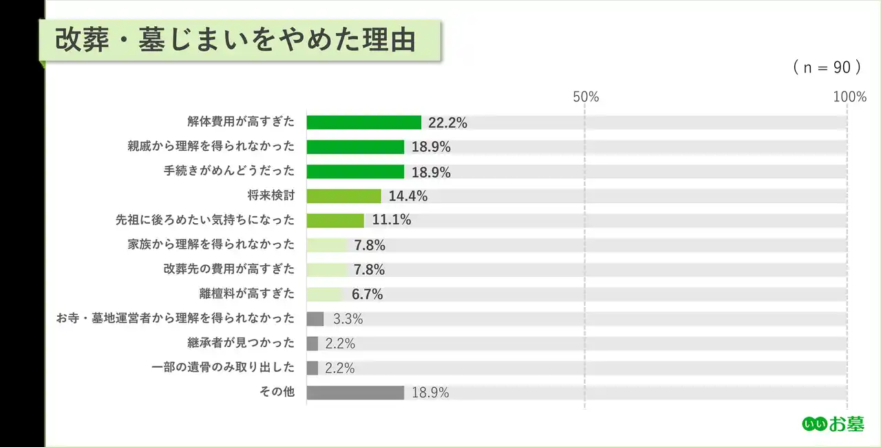 「過去に改葬・墓じまいを検討したが、やめた」理由を伺ったところ、第一位は「解体費用が高すぎた(22.2%)」でした。しかし、前回(26.3%)と比較すると費用面の不一致は減少傾向にあります。 |
