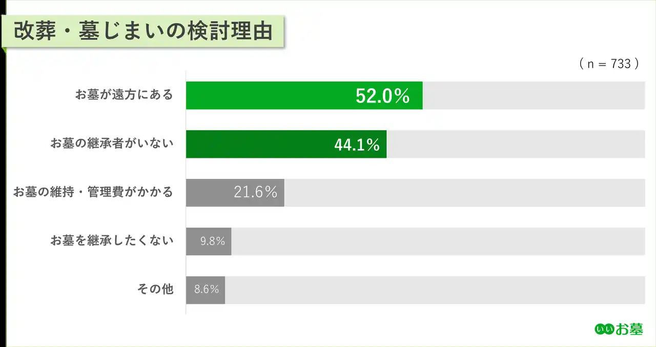 維持・管理費といった金銭的理由の優先度が下がっていることからも、お墓の管理問題が「いつか」ではなく「今すぐ解決すべき課題」となっていることが伺えます。 |