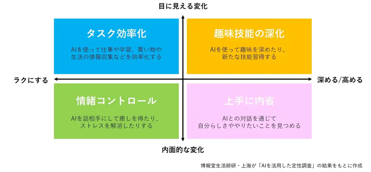 AI利用者が実際にどんな時にAIを利用しているのかその行動実態をインタビュー調査で集め、AI利用の目的を、「ラクにする/軽くする行動」か「深める/高める行動」かという横軸と、「目に見える変化のための行動」か「内面的な変化のための行動」かという縦軸の4領域に整理し「タスク効率化」「趣味技能の深化」「情緒コントロール」「上手に内省」の4つに分類しました。(図) |