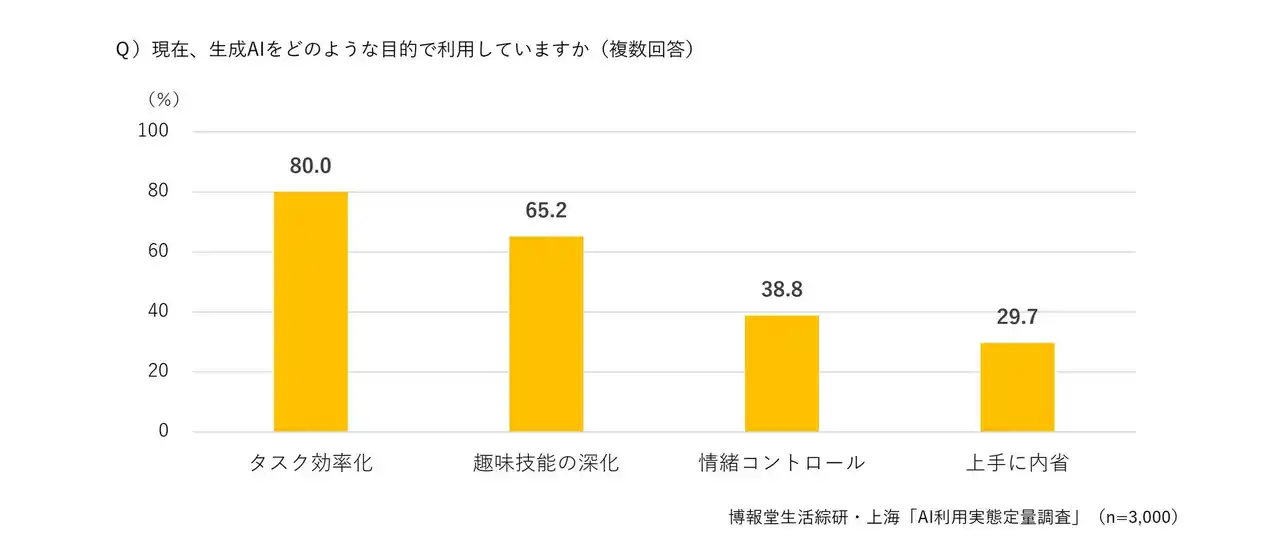 AI利用者に、各目的のために現在AIをどの程度活用しているのかを複数回答できいたところ、「タスク効率化」が80.0%と最も高く、次いで「趣味技能の深化」が65.2%となりました。(データ |