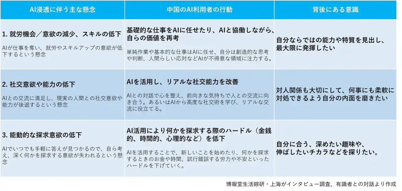 <表>AI浸透に伴うグローバルな懸念と中国のAI利用者の対応行動 |
