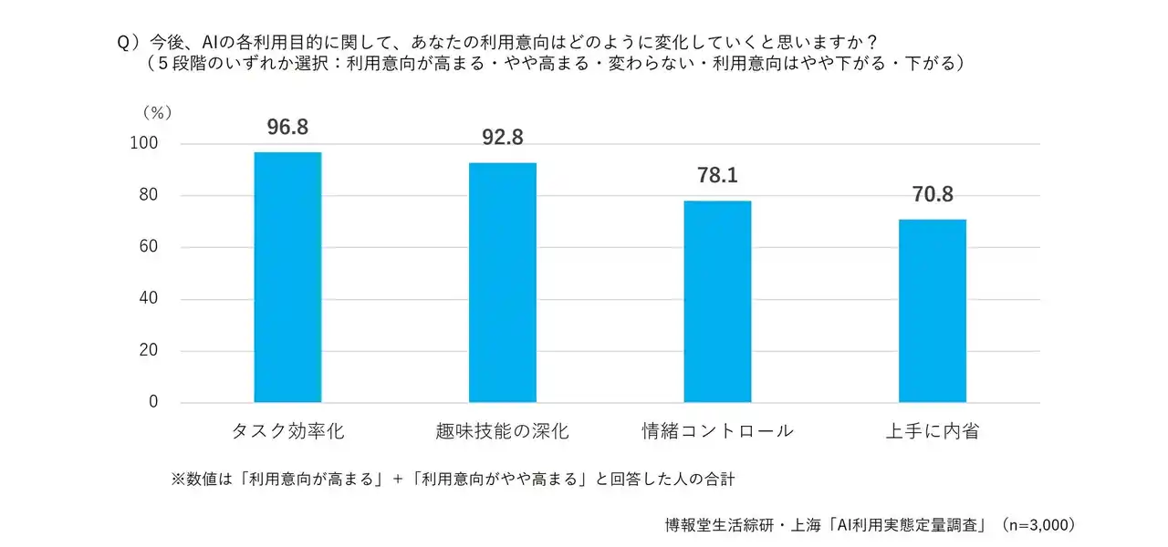 各目的に対し、今後の利用意向を5段階できいたところ、「タスク効率化」(96.8%)や「趣味技能の進化」(92.8%)のために利用したい(「利用意向が高まる」+「やや高まる」)と回答した人は9割超に。また、AI活用を通じて癒しを得たり、ストレスを解消する「情緒コントロール」(78.1%)や、AIとの対話を通じ自分らしさややりたいことをみつめる「内省」(70.8%)のために利用したいという人も7割を超えました。AI利用の目的が、精神的な充足や自己探求といった内面的な領域へと広がっていく兆しがみられます。(データ5) |