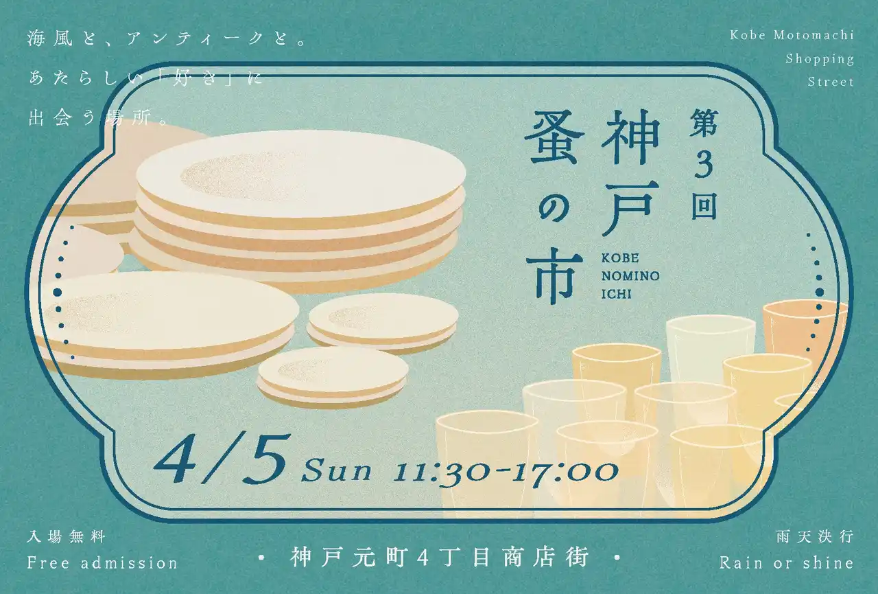 | 「神戸蚤の市」は、一般社団法人 神戸芸術振興協会が主催する、“蚤の市とアート”の出会いを特徴とするイベントです。アクセサリー、インテリア、北欧食器、古着など、世界中から集まった品々が並ぶ光景は港町・神戸が歩んできた交流の歴史を想起させ、さまざまな物語をもつ古きよきものと出会う場所となっています。 | |||||||||||||||||||||||||||||