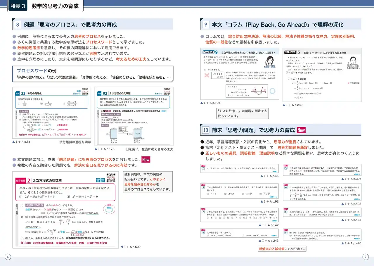 すべての例題に,解答に至るまでの考え方【思考のプロセス】を図解や対比で明示し,例題を理解するだけでなく,数学的思考力も養います。 |