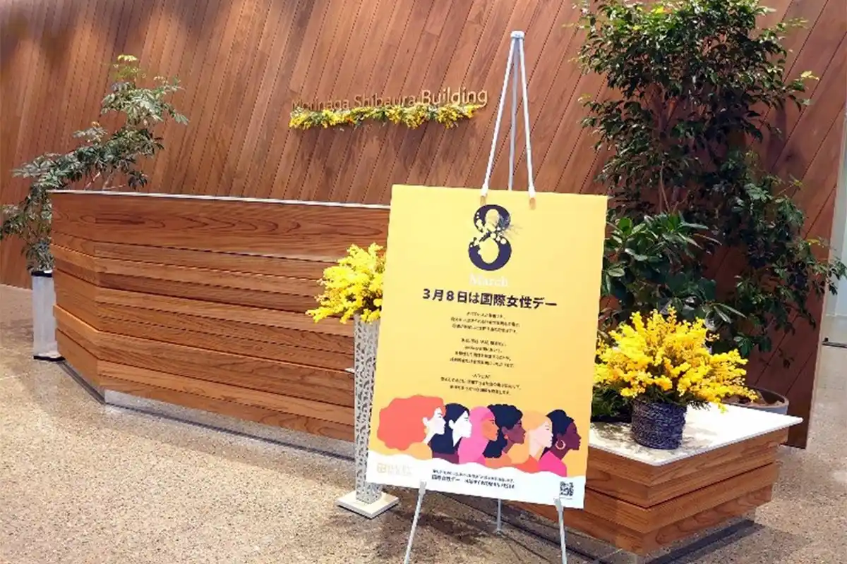 森永製菓株式会社では、国際女性デーに合わせ、本社オフィスをミモザをモチーフにした装飾で彩りました。エントランスには「3月8日は国際女性デー」をテーマにしたビジュアルとともに、国際女性デーの象徴であるミモザの花を用いた装飾を設置。従業員や来訪者に向けて、国際女性デーの意義やメッセージを発信しています。 |