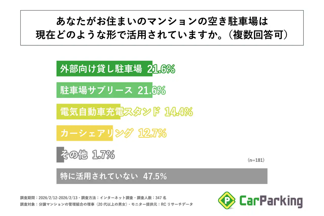 遊休資産を活用した新たな収入源の確保に関心がある分譲マンション管理組合の理事の約半数が、自身のマンションの空き駐車場は「特に活用されていない」と回答 |