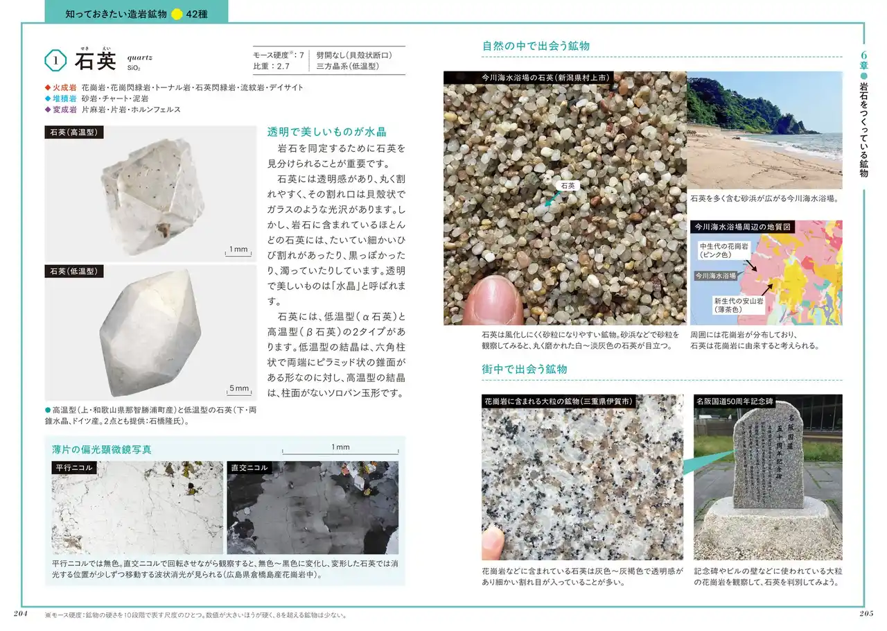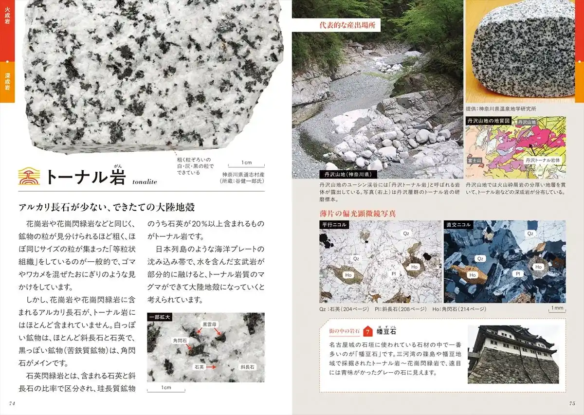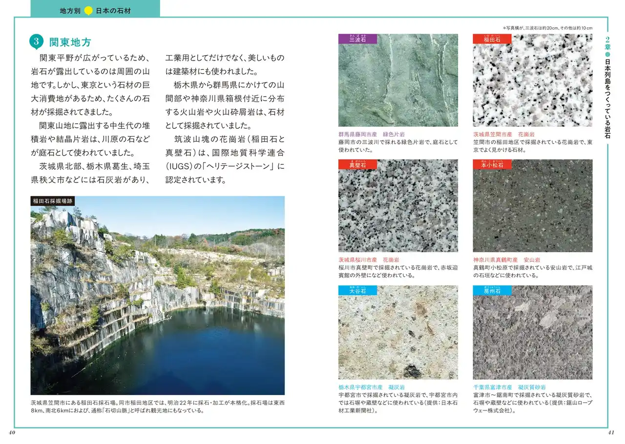 岩石は石材としても多く用いられています。本書の2章では、日本を代表する石材66種を掲載。石材が用いられた建築物や採石場などもあわせて紹介しているので、ぜひ観察してみてください。 |
