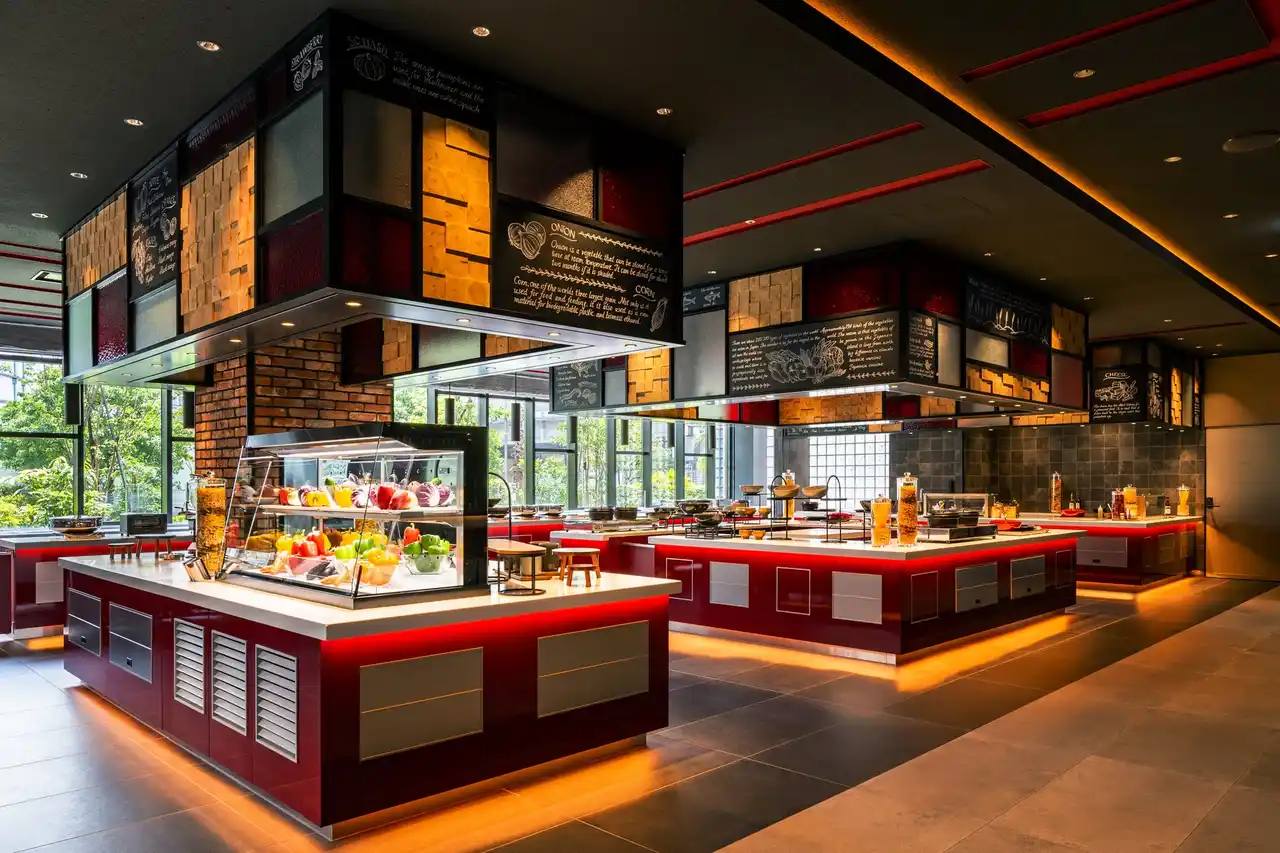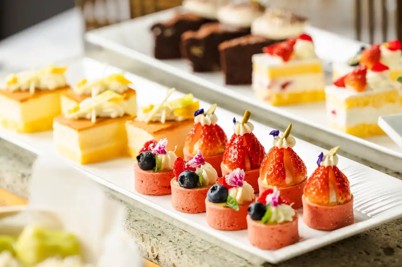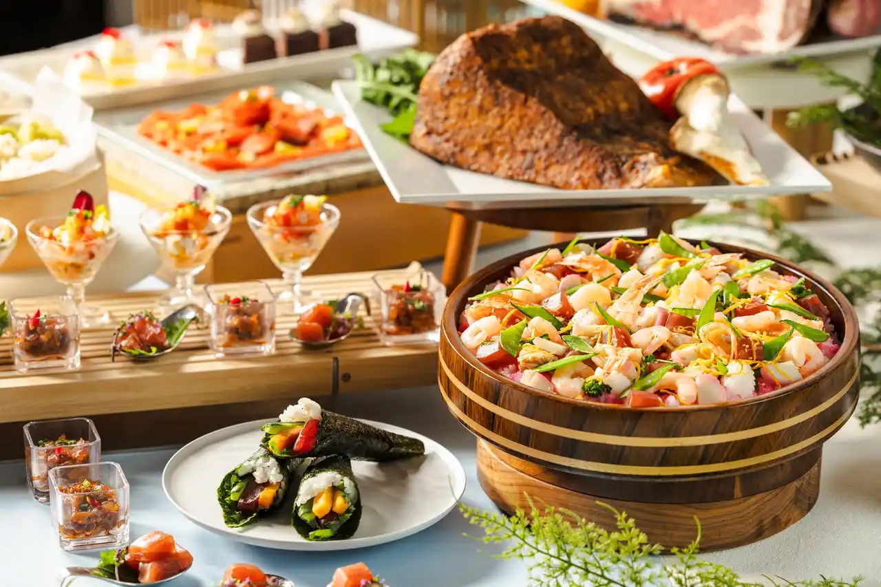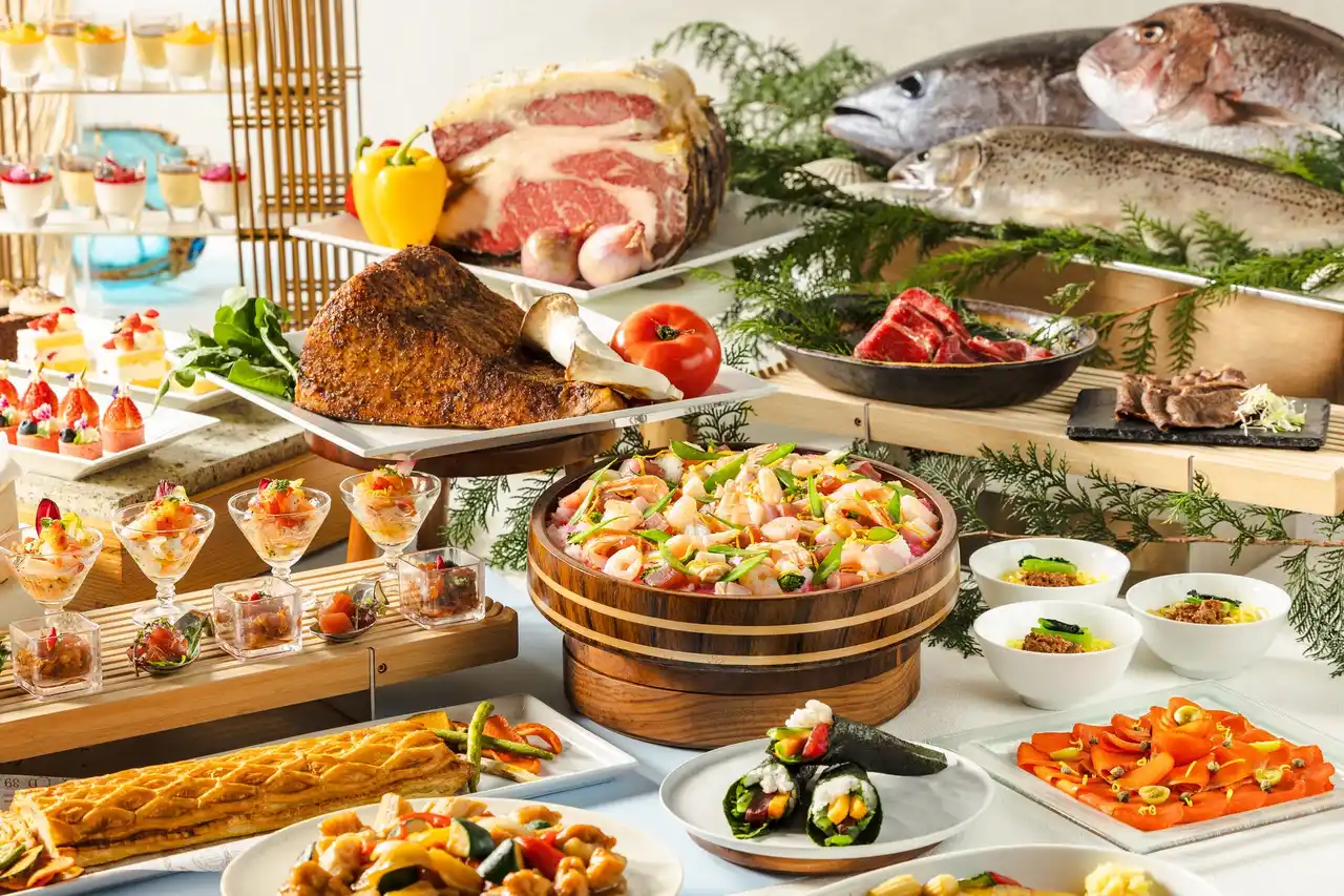 | また、ローストビーフやカジキマグロのロースト、白身魚のパイ包み焼きを目の前で仕上げるカッティングサービスのほか、とろとろのラクレットチーズをかけて味わう料理や国産牛ロースの焼きしゃぶ、お好みの具材で作る手巻き寿司など、豊富なメニューをご用意しております。デザートコーナーには10種類以上のスイーツを取り揃え、キッズコーナーでは日替わりでハンバーグやエビフライ、端午の節句にちなんだ柏もちなどのお子さま向けメニューも充実。ご家族皆さまで心ゆくまで満喫いただけます。 | ||||||||||||||||||||||||