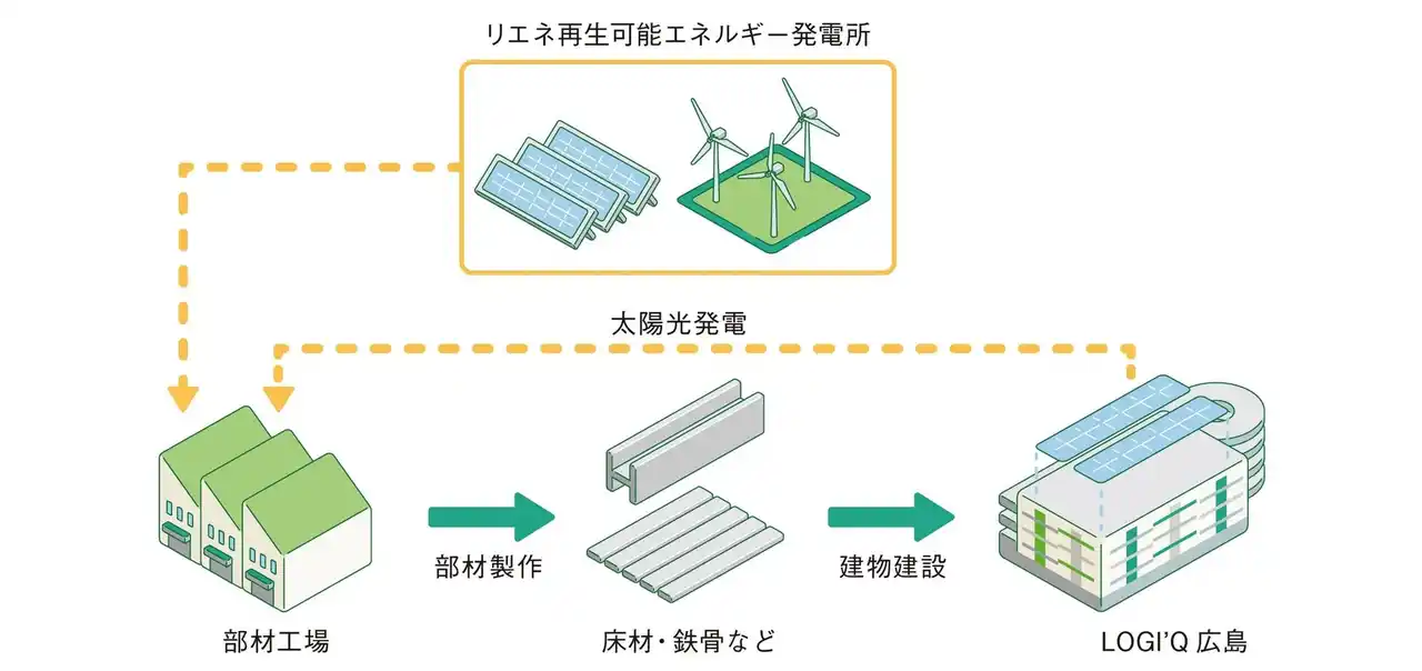 上記によりLOGI’Qシリーズと当社再エネ発電所の循環活用モデルを実現します。この「再エネ循環活用モデル」で制作された部材を物流施設に採用するのは、本物件が初*の取り組みとなります。今後の物件においても、当社の強みである再エネを用いた持続可能な取り組みを積極的に展開してまいります。 |