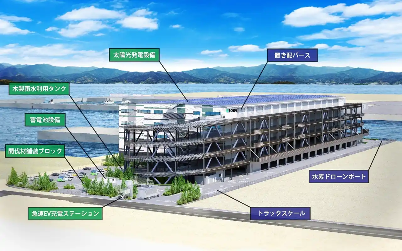 本物件は、LOGI’Qシリーズとしては中国地方初進出となる、延床面積約2万3千坪の環境フラッグシップ物件です。広島県は、関西~九州間の中継拠点であり、海に近く食品加工が盛んな立地特性からも冷凍冷蔵倉庫へのニーズが高いことから、一部区画を冷凍冷蔵対応倉庫としております。また、当社の再生可能エネルギー(以下「再エネ」)を活用し、倉庫の使用電力を100%再エネ化するほか、限られた資源を未来につなぐための「循環」をテーマとした多様な環境施策や水素ドローンポートの設置検討等を進めております。 |