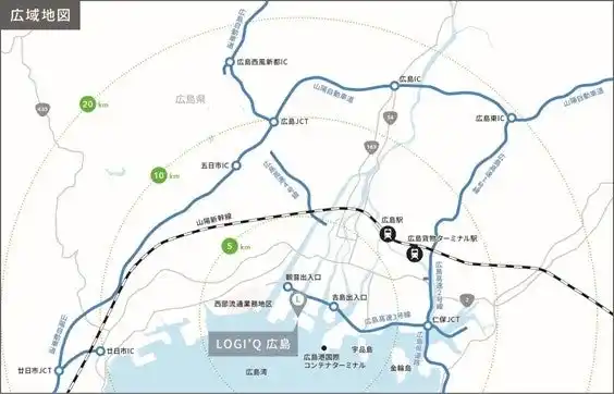 本物件は、広島高速3号線「観音IC」より約4km、「吉島IC」より約3km、そして広島港から約5kmと、広島県内だけではなく、近畿、中国、四国および九州地方をつなぐ、西日本の物流拠点として広域配送に最適な立地に位置します。さらに、市街地への優れたアクセス性により、消費地である広島市内に向けた配送拠点としての利用が想定されます。本物件は最大14テナントが入居可能な延床面積約2万3千坪の大型マルチテナント型施設であり、ランプ経由で各階に接車でき、入居テナント様の輸送効率を向上させます。また、「LOGI’Q」シリーズ初の中国地方への進出であり、当社の目指す全国の物流ネットワーク*の構築にもつなげてまいります。 |