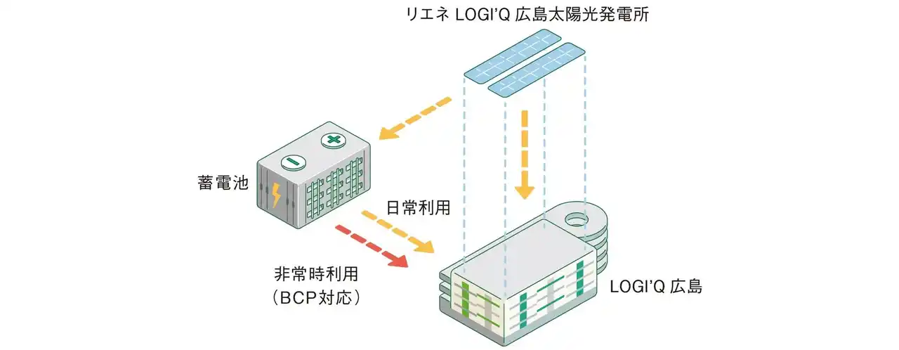 今回導入する蓄電池は、本物件の屋根上太陽光から充電できるほか、電力系統と接続して需給調整・売電等の市場運用にも対応します。加えて、停電時の自立運転にも対応しており、貯蔵した電力を保安負荷へ非常用電力として放電することで、BCPの強化に貢献します。 |