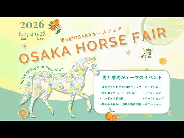 馬に触れたことがない人でも楽しめる、馬づくしの2日間『第6回 OSAKA ホースフェア』が、2026年6月27日(土)・28日(日)に大阪南港ATCで開催されます。 |