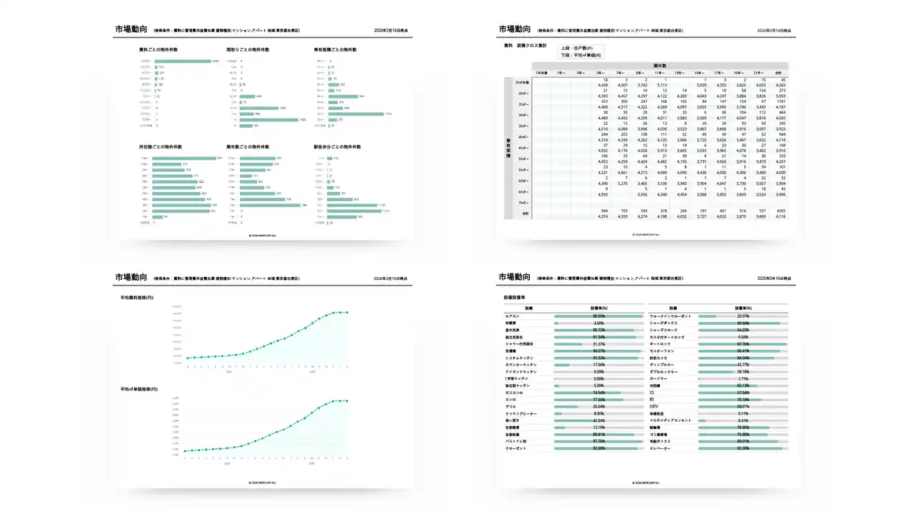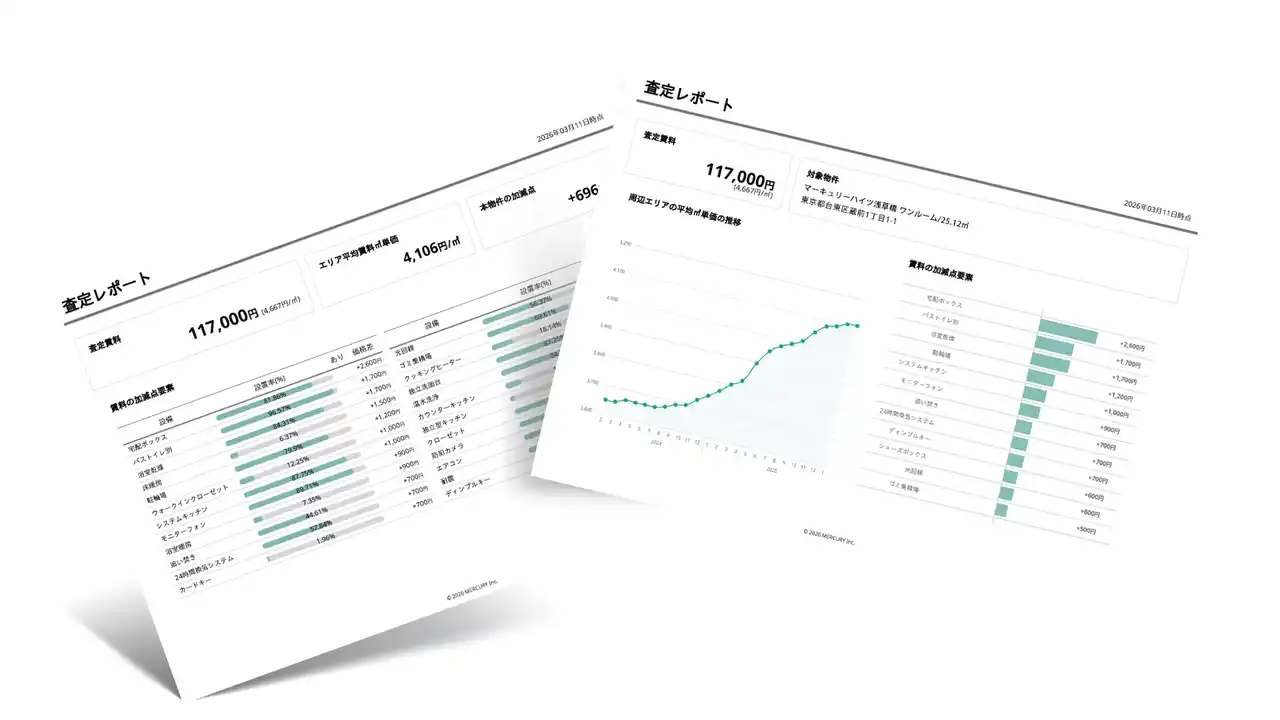 不動産ビッグデータとAI等のテクノロジーを活用し、不動産マーケティングプラットフォームを提供する株式会社マーキュリー(本社:東京都港区 代表取締役:陣 隆浩、証券コード5025、以下「当社」)は、賃貸管理・賃貸仲介業務の効率化を支援する新サービス「賃料査定DX」を2026年3月17日にリリースいたします。 |