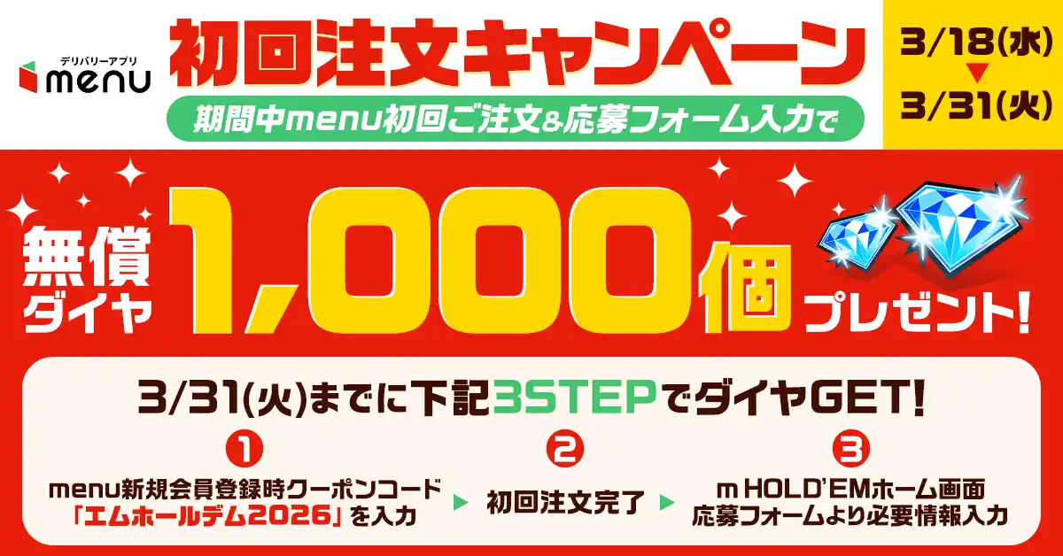 キャンペーン期間中、「m HOLD’EM」が配布するキャンペーンコードを使用して「menu」に新規登録し、初回注文を行った方全員に、ダイヤ1,000個をプレゼントいたします! |