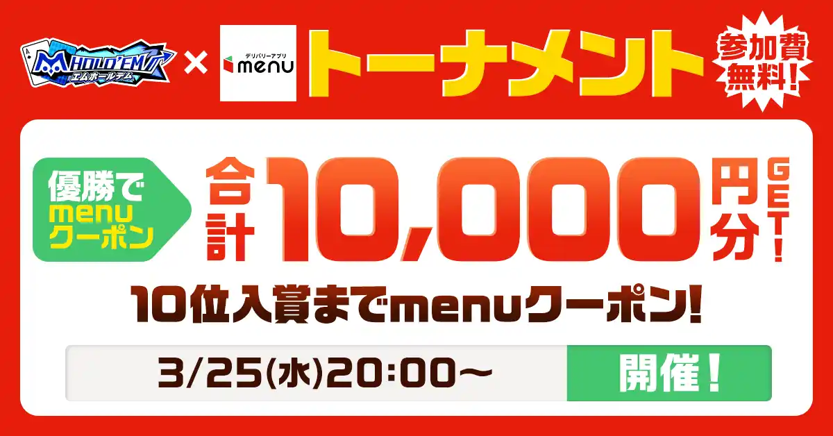 サミー株式会社(本社:東京都品川区 代表取締役 社長執行役員 COO:星野 歩)のスマートフォン向けテキサスホールデムポーカーアプリ「m HOLD’EM(エムホールデム)」は、デリバリーアプリ『menu』の新規登録&初回注文キャンペーンを2026年3月18日(水)から3月31日(火)まで開催いたします。 |