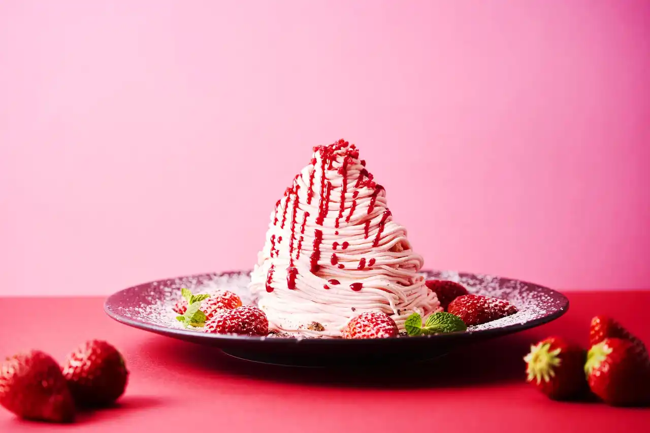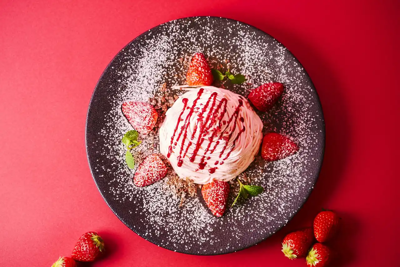 直径約10cmのロールケーキを土台に、「おおくまベリー」とバニラアイス、生クリームを贅沢に重ねました。その上から、ホワイトチョコといちごピューレを合わせた特製クリームをモンブラン状に絞り出し、仕上げに甘酸っぱいベリーソースをあしらっています。プレートの周囲にも半分にカットした「おおくまベリー」を惜しみなく散りばめた、まさに“いちご尽くし”の逸品です。ボリュームがあるため、シェアして召し上がっていただくことも可能です。 |